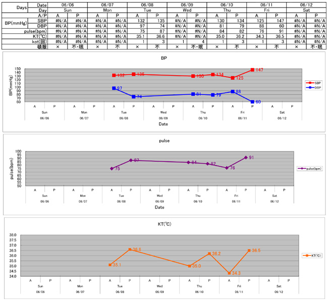 朝のBP 132/97と高め。朝からこの数値ではどうなのか。夕のBP 135/74とやはり高め。やはりあまり精神的に安定していないのだろうか。