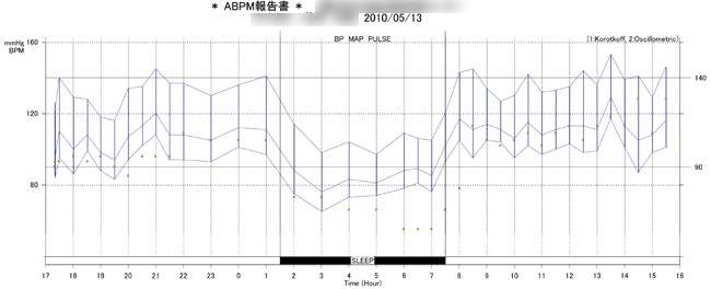 夜間就寝中のSBPの平均は105mmHg,DBPの平均は75mmHg。夜間はきちんと下がっているが。