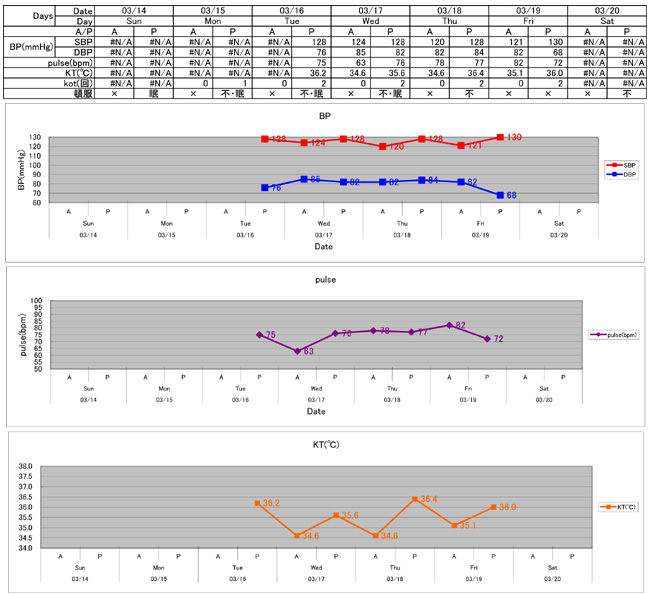 朝のBP 121/82と落ち着いている。夕のBP 130/68と高値を示している。ある程度落ち着く前の段階ではSBP 150mmHgを示したりもしている。「帰宅直後」とは言え高すぎる。朝のBPは落ち着いており,日中平時のSBPも125~130mmHgとやや高いながらも落ち着いてはいる。しかし夕のBPが高い傾向は続いている。