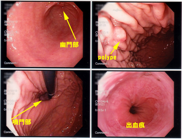 胃カメラの結果では「幽門部に索状の出血痕があり胃炎と言える。噴門部が広がって上に上がっており,食道裂肛ヘルニアとなっいる。噴門部にも発赤があり逆流食道炎と言える。またポリープが見つかった。見た目上は良性と思われるが念のため病理検査をするので生検する」とのこと。