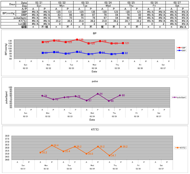 朝のBP 125/83とやや高め。なかなか起きられずに慌てて起きたせいだろうか。夕のBP 131/86と高い数値になっている。やはり多忙や遅帰りが