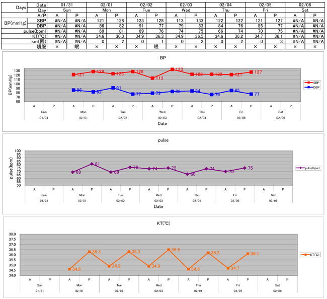 朝のBP 126/89と少し高めだがやや落ち着いてはいる。夕のBP 124/74と落ち着いている。夕のBPは引き続いて落ち着いている状態が維持できている。
